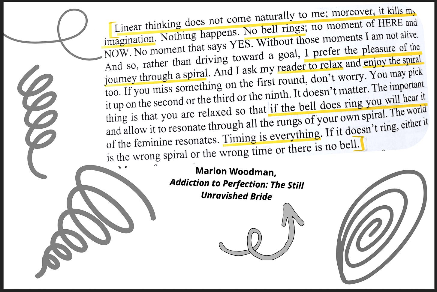 Oprócz zestresowania ten oto fragment, w którym Woodman podkreśla odejście od liniowości w pisaniu na rzecz „spiralności”, mocno mnie zatrzymał. Bo o ile „myślenio-czucie” spiralne, gwieździste (i w wielu innych kształtach) wydaje mi się dość naturalne, to już pisanie takie słowo po słowie, zdanie po zdaniu, strona po stronie od 1 do 100 z tą spiralą jakoś mi się gryzło w pierwszym odczuciu.